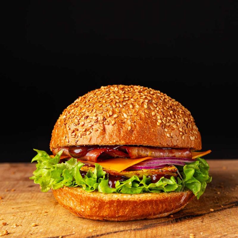 Grilowany filet z kurczka 120g, sałata strzępiasta, cebula czerwona, ser cheddar, bekon, sos bbq, majonez